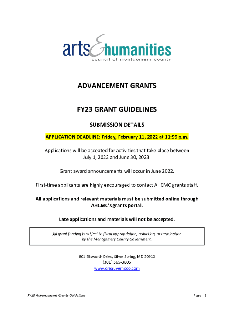 ADVANCEMENT GRANTS FY23 GRANT GUIDELINES SUBMISSION DETAILS APPLICATION DEADLINE: Friday, February 11, 2022, at 11:59 p.m. Applications will be accepted for activities that take place between July