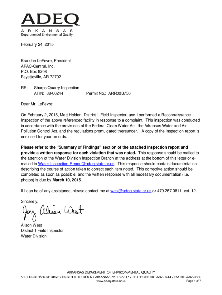 February 24, 2015Brandon Before, President Accentual, Inc. P.O. Box 9208 Fayetteville, AR 72702 RE:Sharps Quarry Inspection AKIN: 8800244Permit No.: ARR00B750Dear Mr. Before: On February 2, 2015,