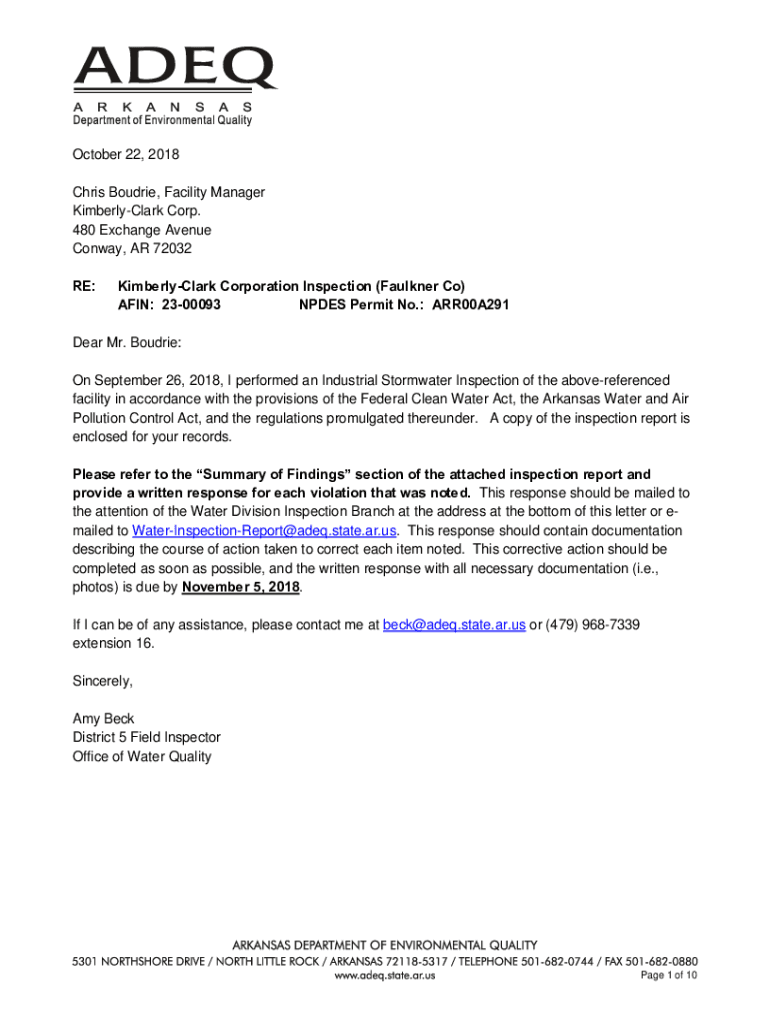 October 22, 2018, Chris Boudoir, Facility Manager Kimberly Clark Corp. 480 Exchange Avenue Conway, AR 72032 RE:Kimberly Clark Corporation Inspection (Faulkner Co) AKIN: 2300093 NODES Permit No.: ARR00A291Dear