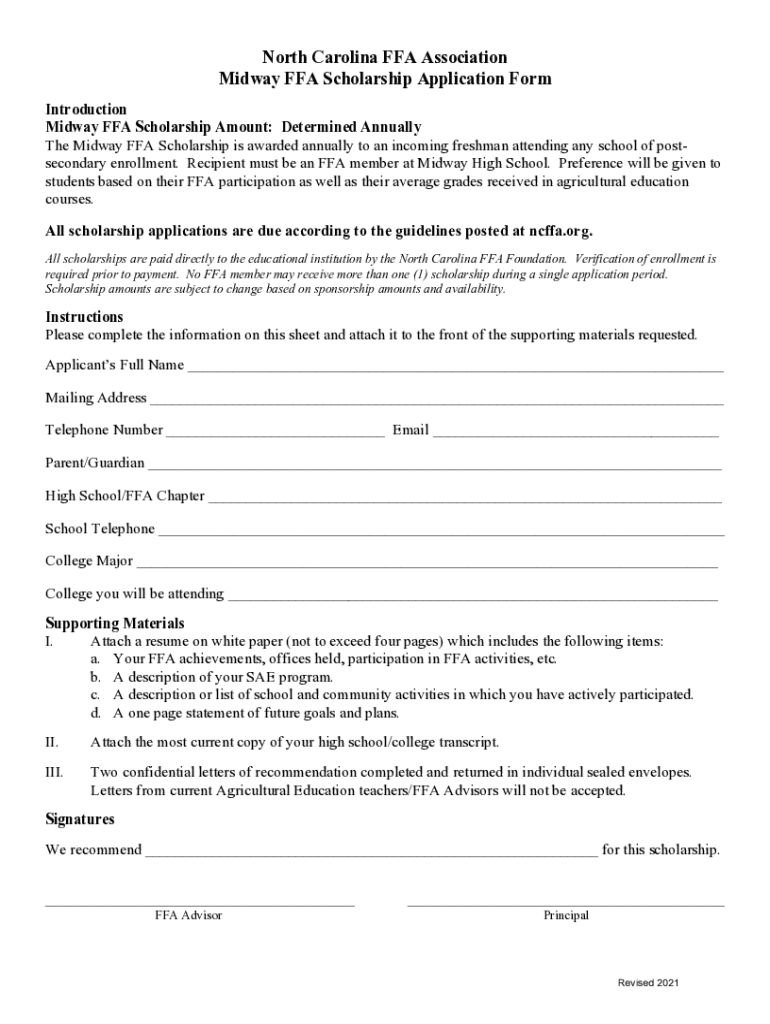 North Carolina FFA Association Midway FFA Scholarship Application Form Introduction Midway FFA Scholarship Amount: Determined Annually The Midway FFA Scholarship is awarded annually to an incoming