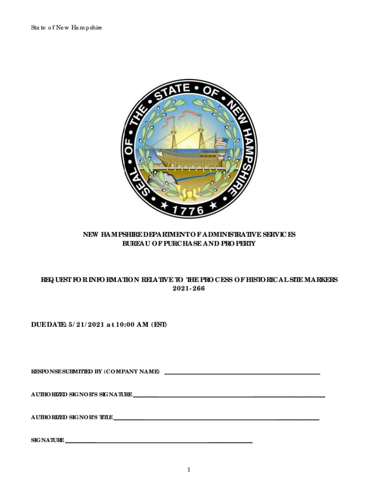 State of New Hampshire DEPARTMENT OF ADMINISTRATIVE SERVICES BUREAU OF PURCHASE AND PROPERTYREQUEST FOR INFORMATION RELATIVE TO THE PROCESS OF HISTORICAL SITE MARKERS 2021266DUE DATE: 5/21/2021 at
