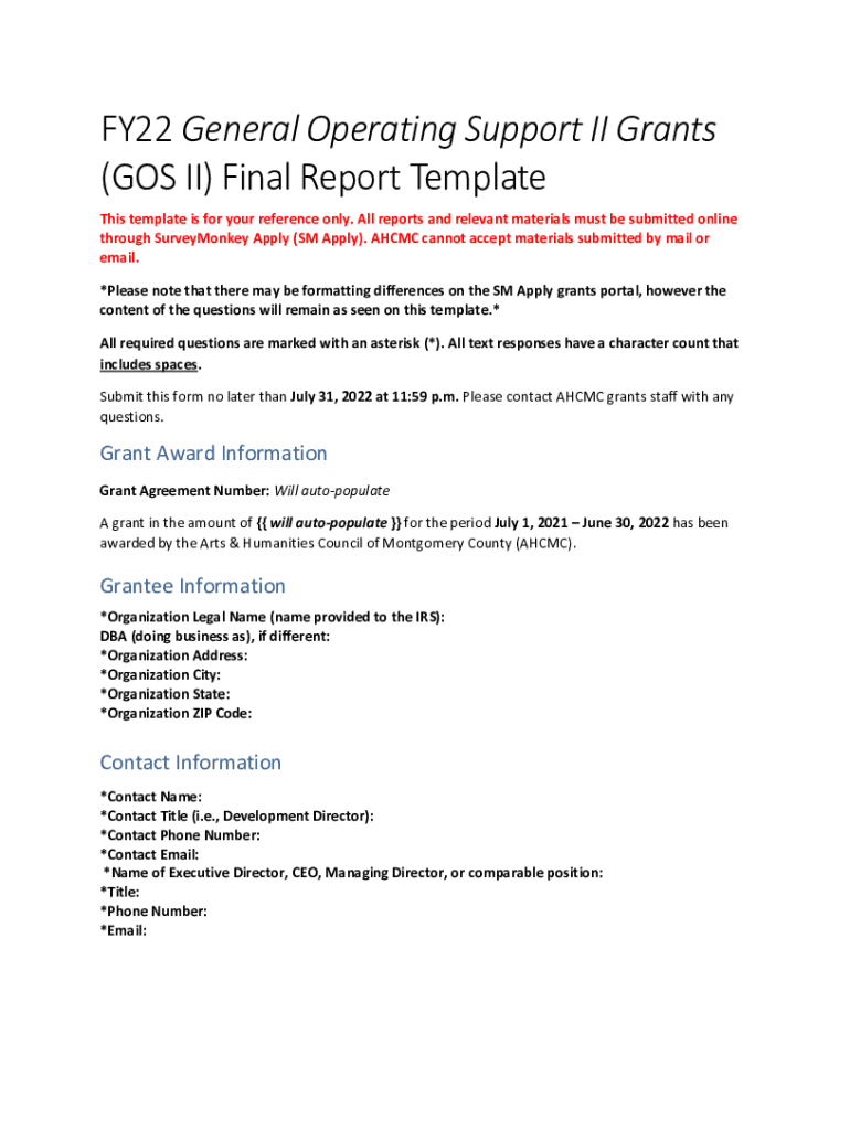 FY22 General Operating Support II Grants (GO SII) Final Report Template This template is for your reference only. All reports and relevant materials must be submitted online through SurveyMonkey Apply