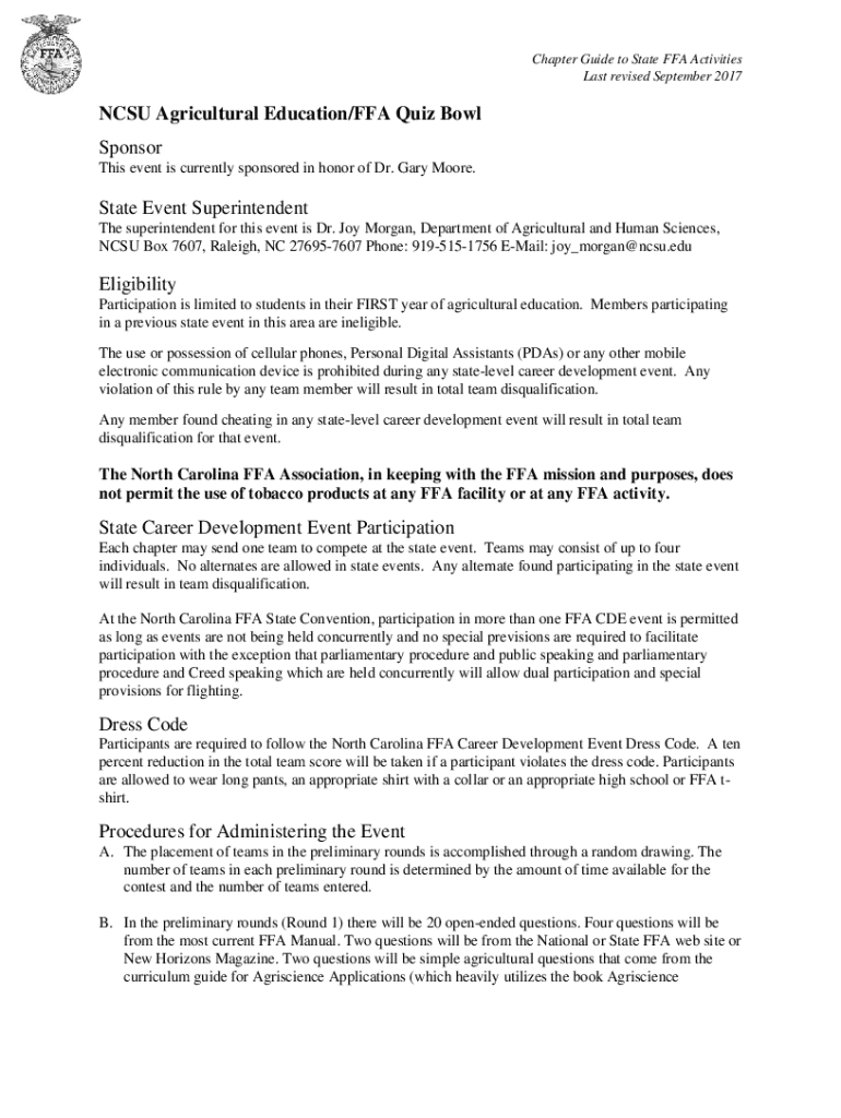 Chapter Guide to State FFA Activities Last revised September 2017NCSU Agricultural Education/FFA Quiz Bowl Sponsor This event is currently sponsored in honor of Dr. Gary Moore. State Event Superintendent