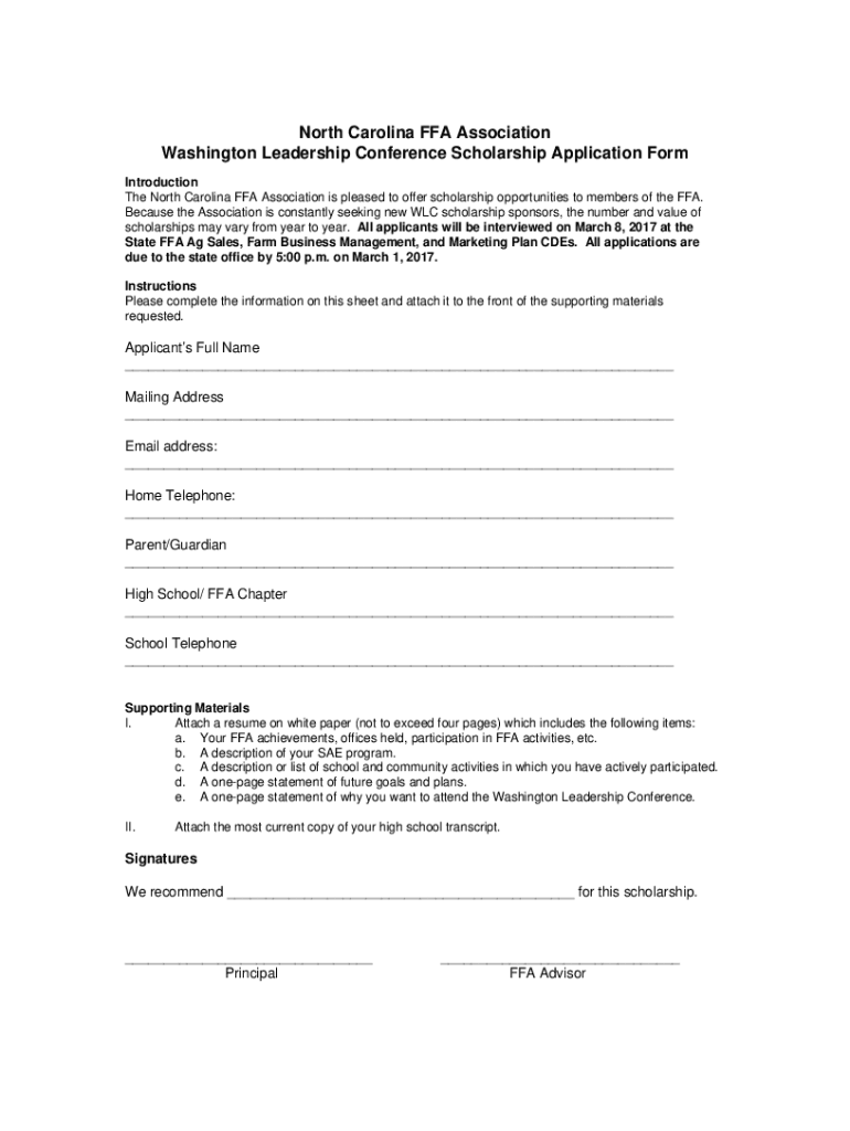 North Carolina FFA Association Washington Leadership Conference Scholarship Application Form Introduction The North Carolina FFA Association is pleased to offer scholarship opportunities to members
