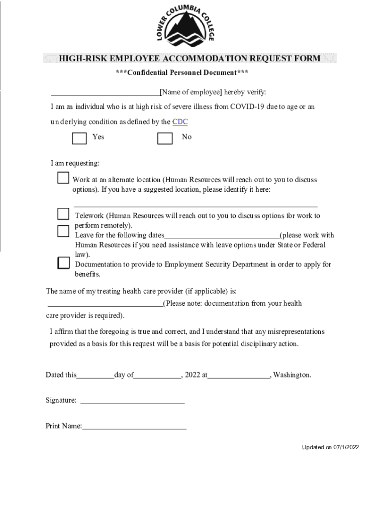 HIGH-RISE EMPLOYEE ACCOMMODATION REQUEST FORM ***Confidential Personnel Document*** [Name of employee] hereby verify: I am an individual who is at high risk of severe illness from COVID-19 due to