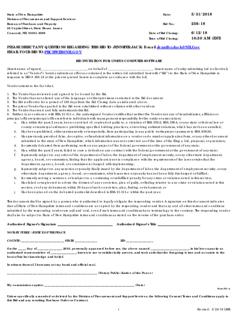 State of New Hampshire Division of Procurement and Support ServicesDate:5/31/2018Bureau of Purchase and Property 25 Capitol Street, State House Annexed No.:25618Concord, NH 033016398Date of Bid Closing: