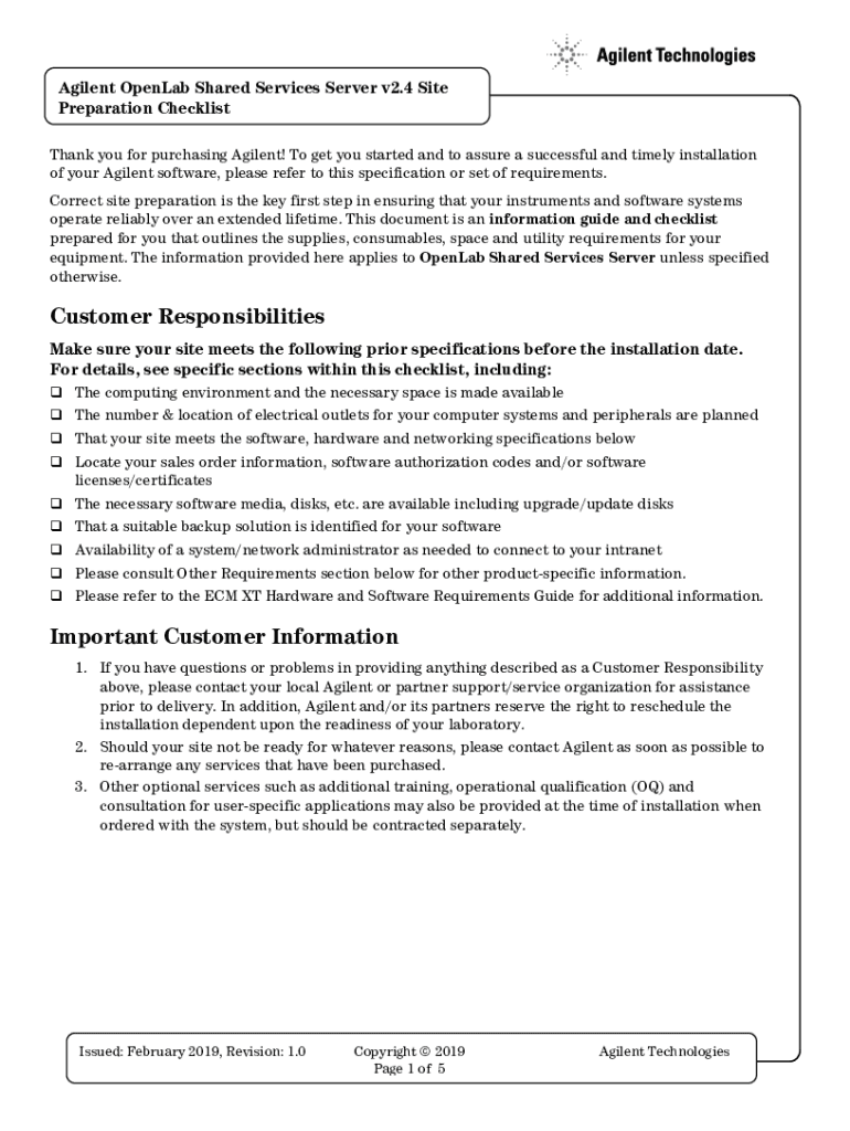 Get the free Software Site Preparation Checklist Template - Agilent Technologies