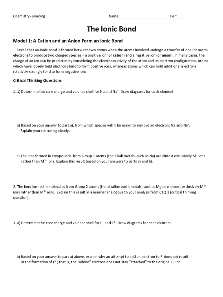 Chemistry BondingName: ___Per: ___The Ionic Bond Model 1: A Cation and an Anion Form an Ionic Bond Recall that an ionic bond is formed between two atoms when the atoms involved undergo a transfer