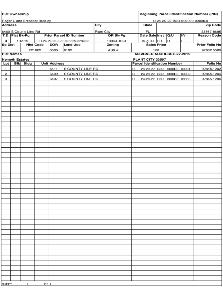 Plat OwnershipBeginning Parcel Identification Number (PIN)Roger L and Erzsebet Bradley AddressCity6409 S County Line Rd T.D. Plat Supplant City OR Bogus District Parcel ID Number13219 U242922ZZZ00000507040.0
