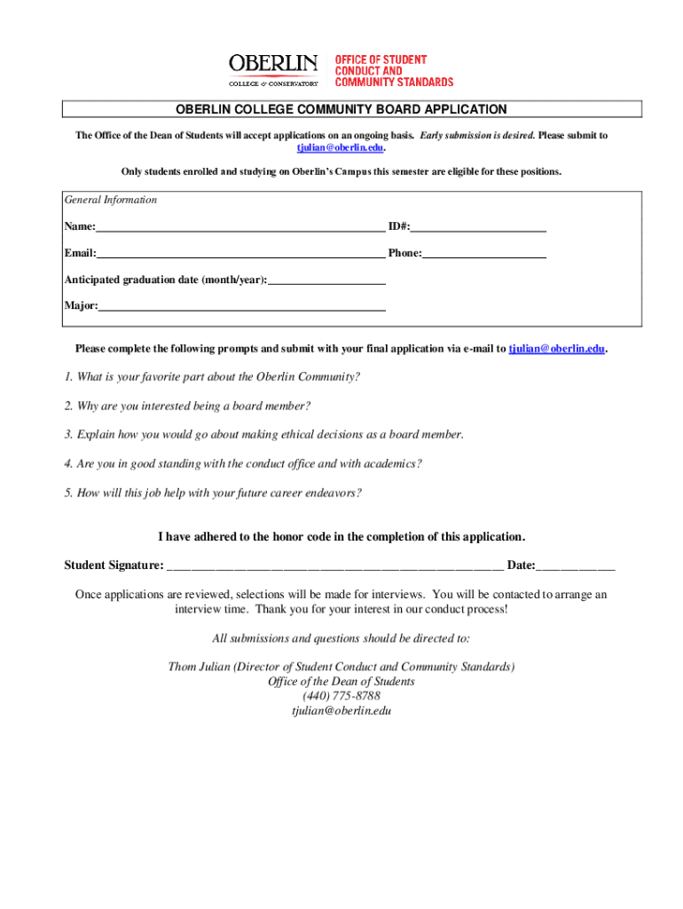 OBERLIN COLLEGE COMMUNITY BOARD APPLICATION The Office of the Dean of Students will accept applications on an ongoing basis. Early submission is desired. Please submit to tjulian@oberlin.edu. Only