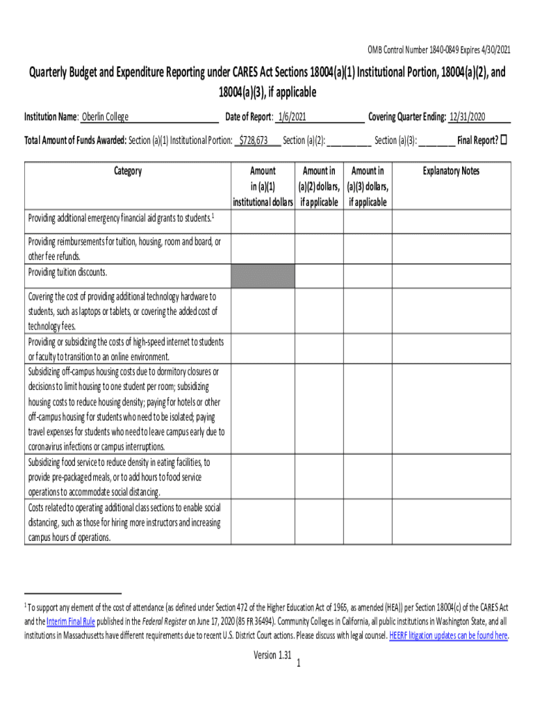 OMB Control Number 18400849 Expires 4/30/2021Quarterly Budget and Expenditure Reporting under CARES Act Sections 18004(a)(1) Institutional Portion, 18004(a)(2), and 18004(a)(3), if applicable Institution