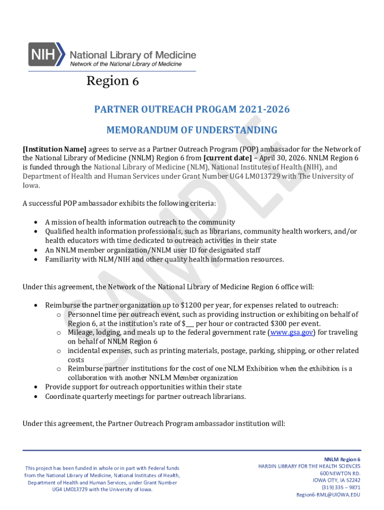 PARTNER OUTREACH PROGRAM 20212026 MEMORANDUM OF UNDERSTANDING [Institution Name] agrees to serve as a Partner Outreach Program (POP) ambassador for the Network of the National Library of Medicine