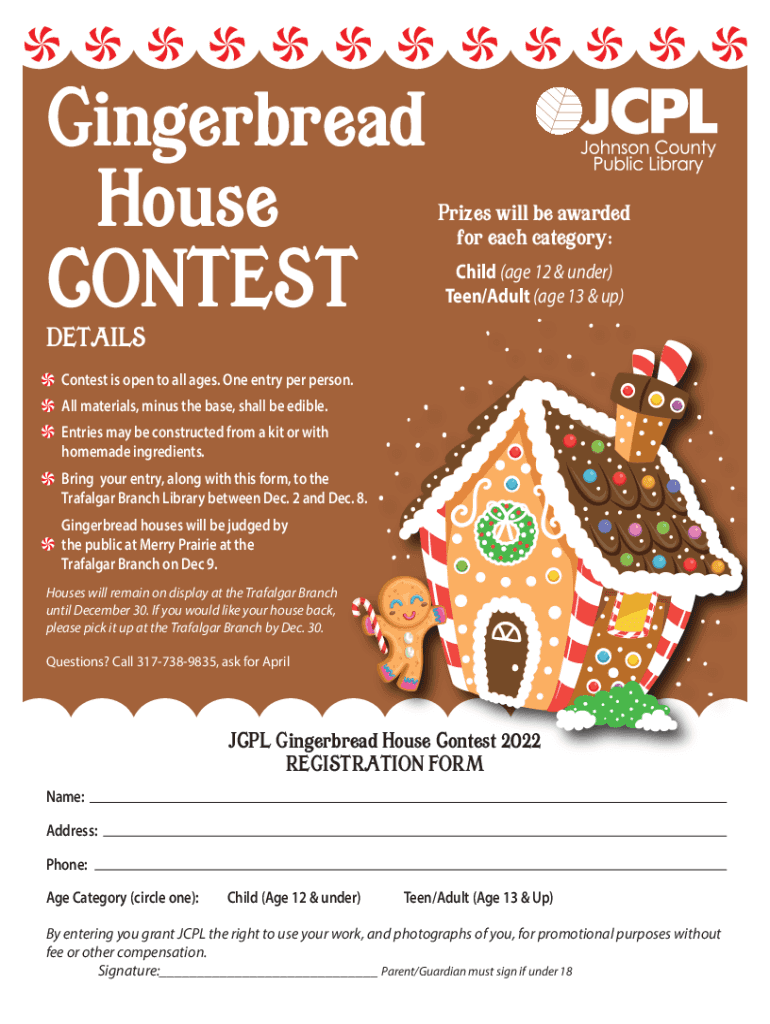 Gingerbread House Contemporizes will be awarded for each category: Child (age 12 & under) Teen/Adult (age 13 & up)DETAILSContest is open to all ages. One entry per person. All materials, minus the