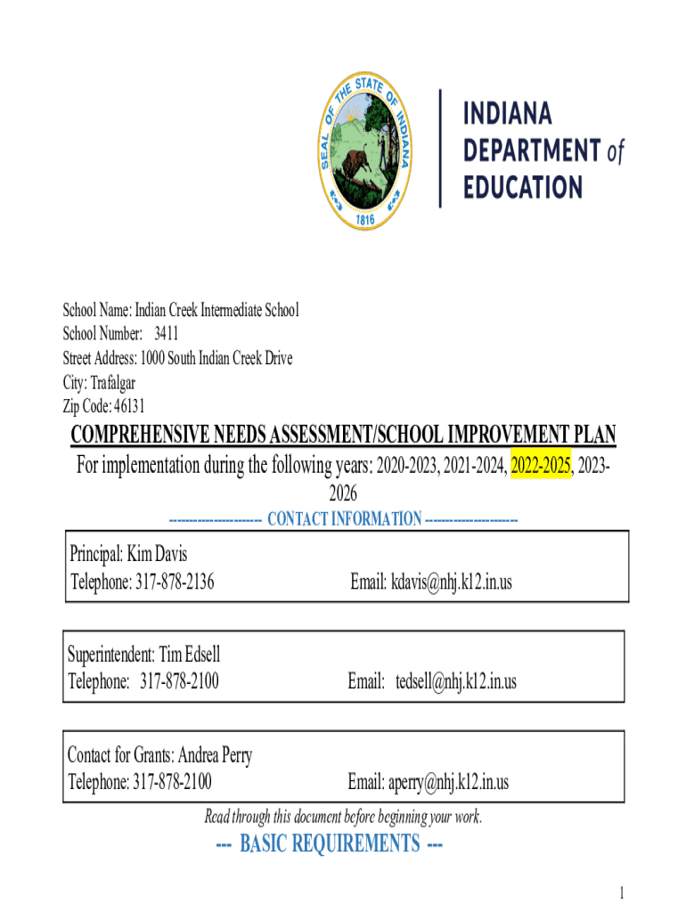 School Name: Indian Creek Intermediate School Number: 3411 Street Address: 1000 South Indian Creek Drive City: Trafalgar Zip Code: 46131COMPREHENSIVE NEEDS ASSESSMENT/SCHOOL IMPROVEMENT PLAN For implementation