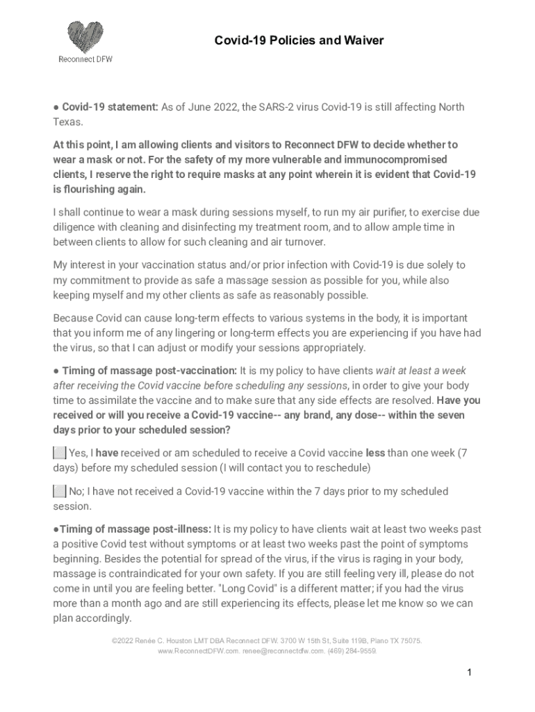 COVID-19 Policies and Waiver COVID-19 statement: As of June 2022, the SARS2 virus COVID-19 is still affecting North Texas. At this point, I am allowing clients and visitors to Reconnect DFW to decide