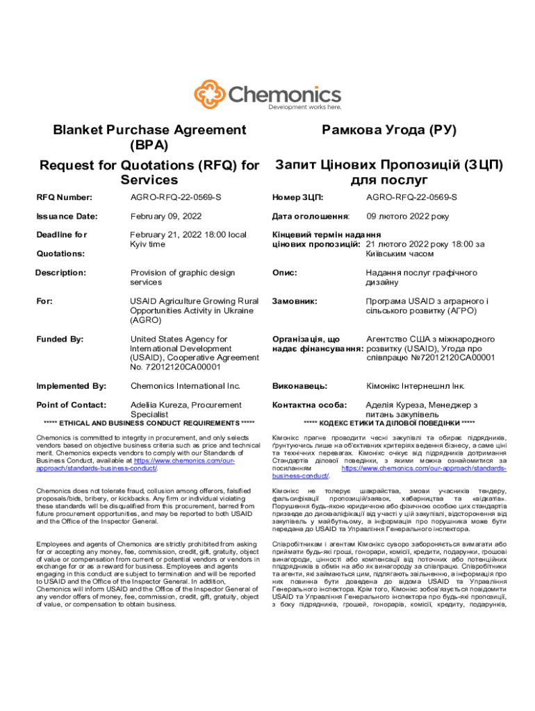 Get the free BLANKET PURCHASE AGREEMENT (BPA) REQUEST FOR QUOTATIONS (RFQ)