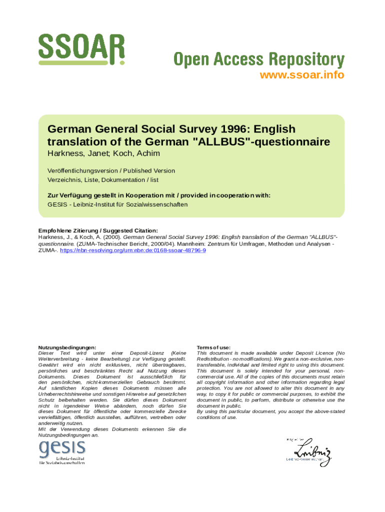 WWW.soar.info German General Social Survey 1996: English translation of the German \” ALBUS\” questionnaire Harkness, Janet; Koch, AchimVerffentlichungsversion / Published Version Verzeichnis,