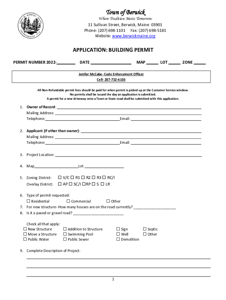 Town of Berwick Where Tradition Meets Tomorrow 11 Sullivan Street, Berwick, Maine 03901 Phone: (207) 6981101 Fax: (207) 6985181 Website: www.berwickmaine.orgAPPLICATION: BUILDING PERMIT NUMBER 2022DATEMAPLOTZONEJenifer