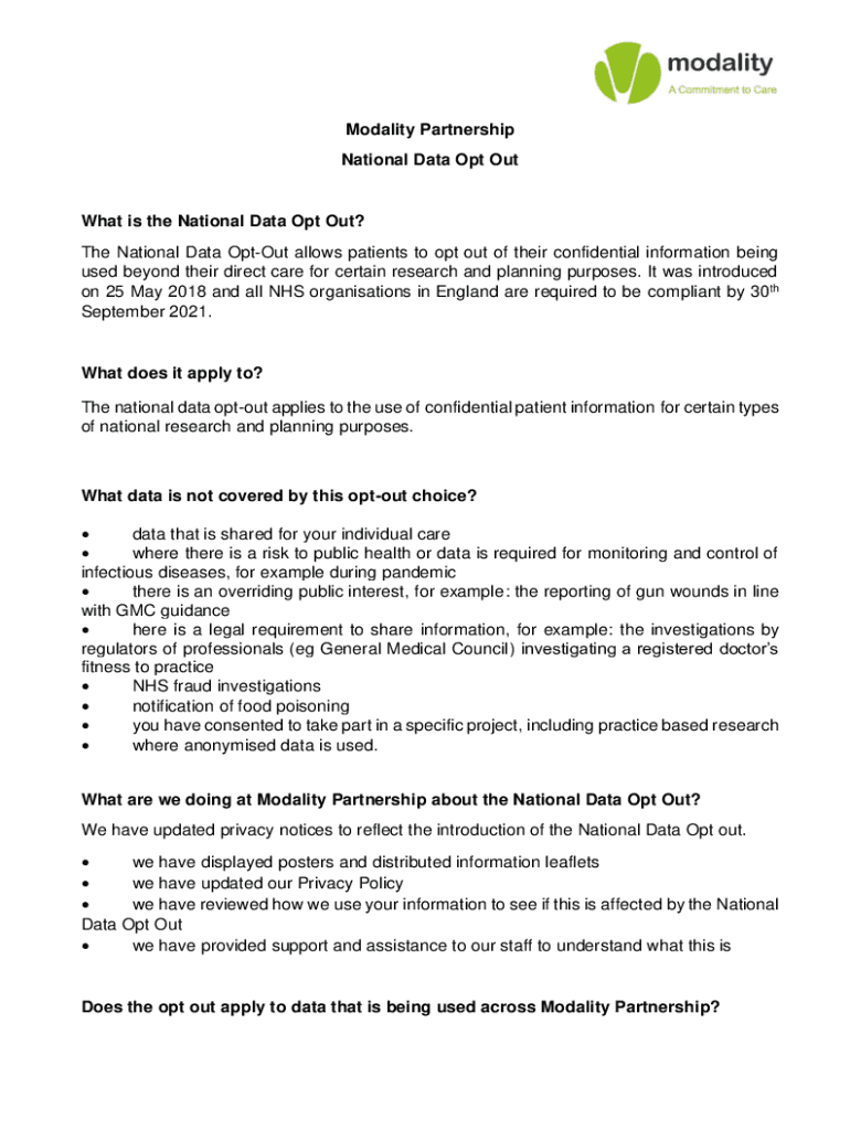 Modality Partnership National Data Opt Outwit is the National Data Opt Out? The National Data Opt-out allows patients to opt out of their confidential information being used beyond their direct care
