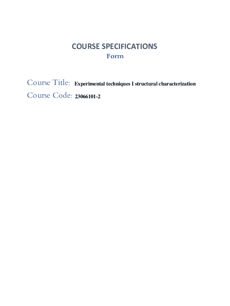 COURSE SPECIFICATIONS Concourse Title: Experimental techniques I structural characterization Course Code: 230661012Date: 2018 12 28Institution: Umm Laura UniversityCollege: Glamour University CollegeDepartment: