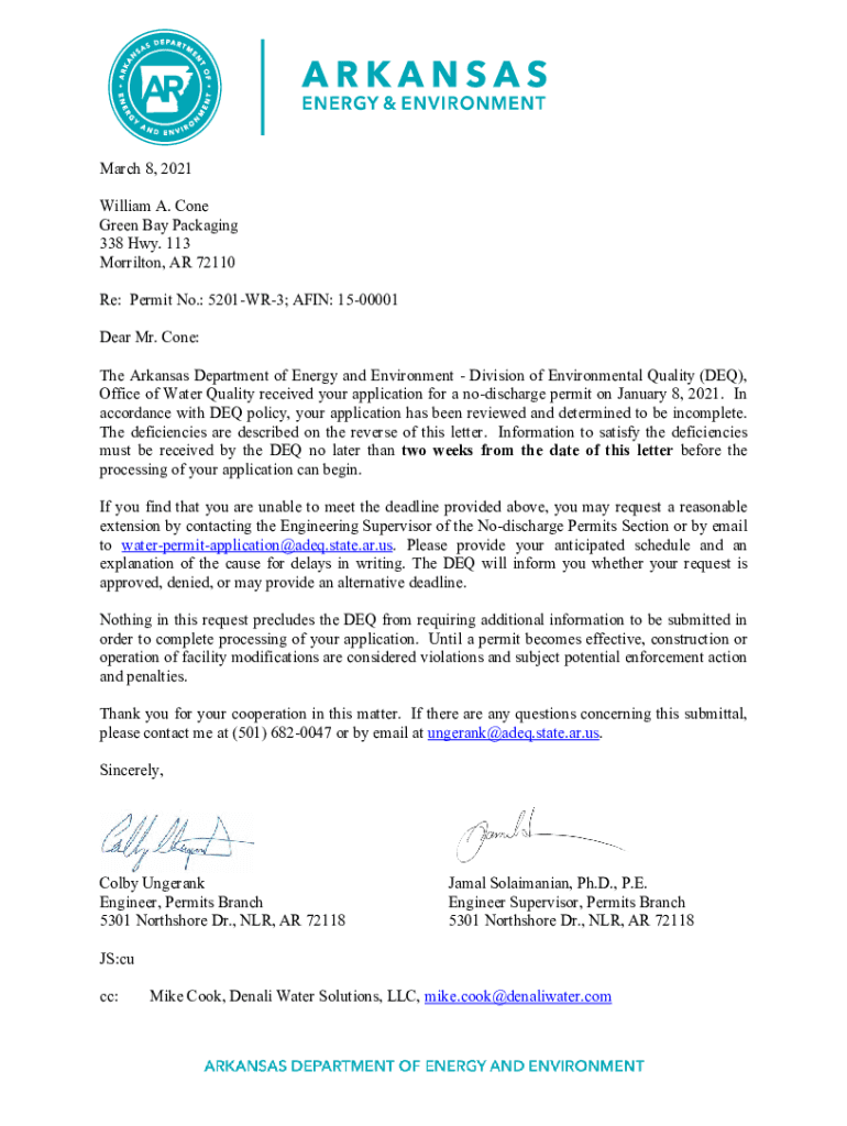 March 8, 2021, William A. Cone Green Bay Packaging 338 Hwy. 113 Morrison, AR 72110 Re: Permit No.: 5201WR3; AKIN: 1500001 Dear Mr. Cone: The Arkansas Department of Energy and Environment Division