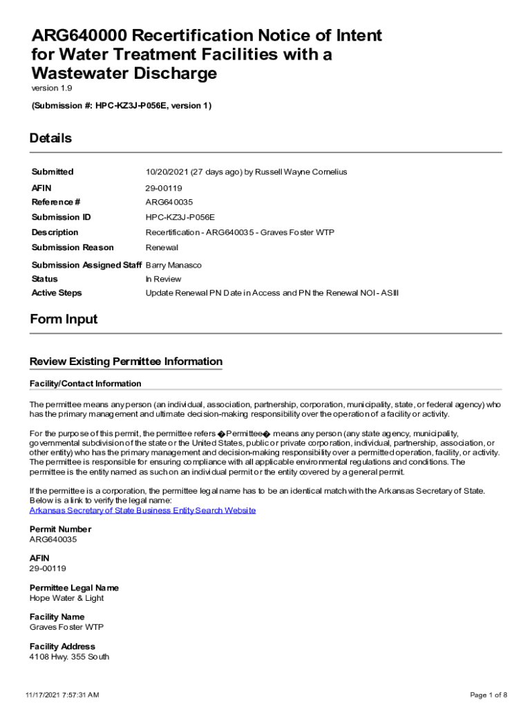 ARG640000 Recertification Notice of Intent for Water Treatment Facilities with a Wastewater Discharge version 1.9(Submission #: HPCKZ3JP056E, version 1)Details Submitted10/20/2021 (27 days ago) by