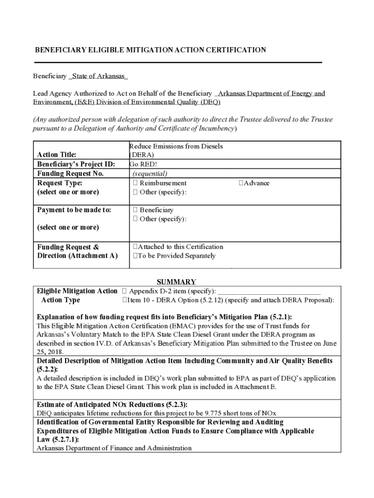 BENEFICIARY ELIGIBLE MITIGATION ACTION CERTIFICATION Beneficiary _State of Arkansas_ Lead Agency Authorized to Act on Behalf of the Beneficiary Arkansas Department of Energy and Environment, (E&E)