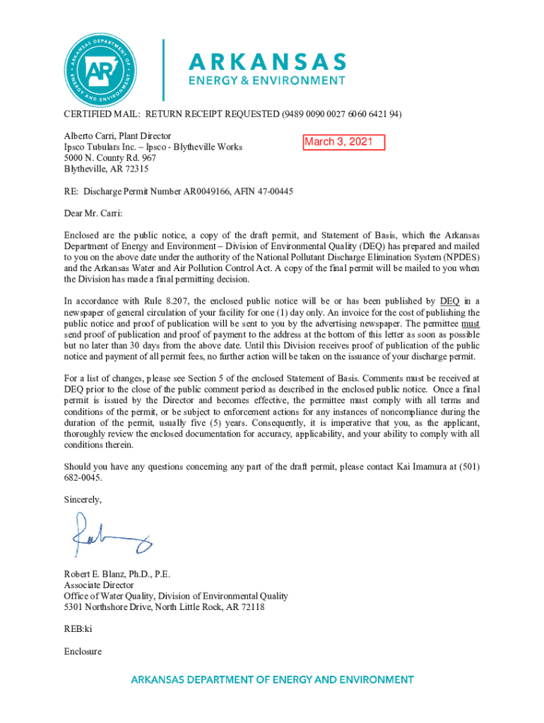 CERTIFIED MAIL: RETURN RECEIPT REQUESTED (9489 0090 0027 6060 6421 94) Alberto Carry, Plant Director Disco Tubular Inc. Disco Blytheville Works 5000 N. County Rd. 967 Blytheville, AR 72315March 3,
