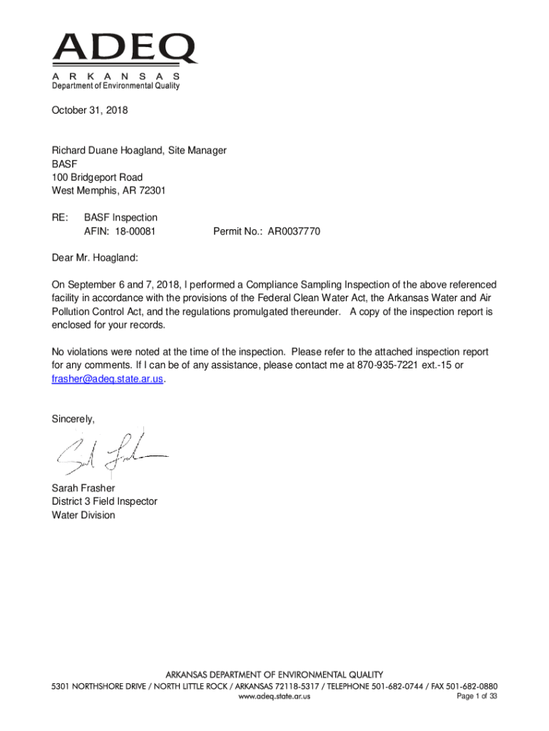 October 31, 2018Richard Duane Hoagland, Site Manager BASF 100 Bridgeport Road West Memphis, AR 72301 RE:BASF Inspection AKIN: 1800081Permit No.: AR0037770Dear Mr. Hoagland: On September 6 and 7, 2018,