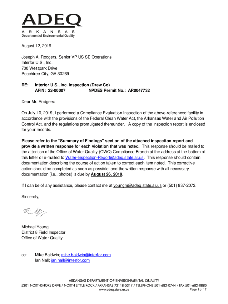 August 12, 2019, Joseph A. Rodgers, Senior VP US SE Operations Interior U.S., Inc. 700 West park Drive Peachtree City, GA 30269 RE:Interior U.S., Inc. Inspection (Drew Co) AKIN: 2200007 NODES Permit
