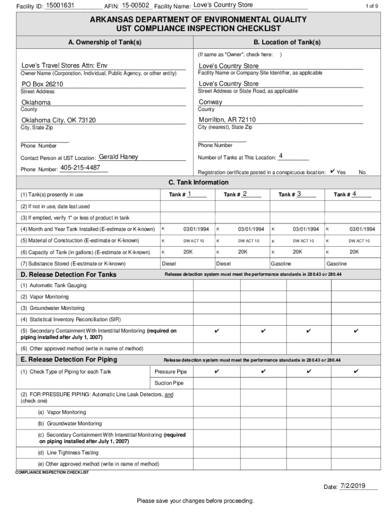 1 of 9Love\'s Country Store 1500502 Facility Name: ___ 15001631 Facility ID: ___ AKIN: ___ARKANSAS DEPARTMENT OF ENVIRONMENTAL QUALITY MUST COMPLIANCE INSPECTION CHECKLIST A. Ownership of Tank(s)B.