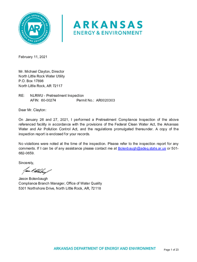 1, 2021 February 11Mr. Michael Clayton, Director North Little Rock Water Utility 7898 P.O. Box 17 North Little Rock, AR 72 2117 RE:NLR RTU Peter treatment INSP section AKIN N: 6000274 4 303 Permit