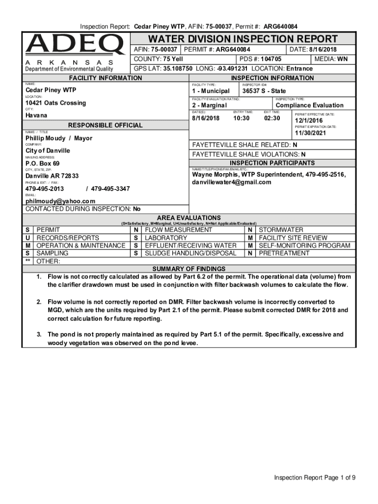 Inspection Report: Cedar Piney WTP, AKIN: 7500037, Permit #: ARG640084WATER DIVISION INSPECTION REPORT AKIN: 7500037PERMIT #: ARG640084COUNTY: 75 Cellmate: 8/16/2018PDS #: 104705MEDIA: WINGS LAT: