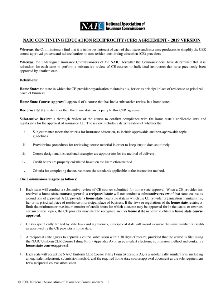 NAIL CONTINUING EDUCATION RECIPROCITY (CER) AGREEMENT 2019 VERSION Whereas, the Commissioners find that it is in the best interest of each of their states and insurance producers to simplify the CER