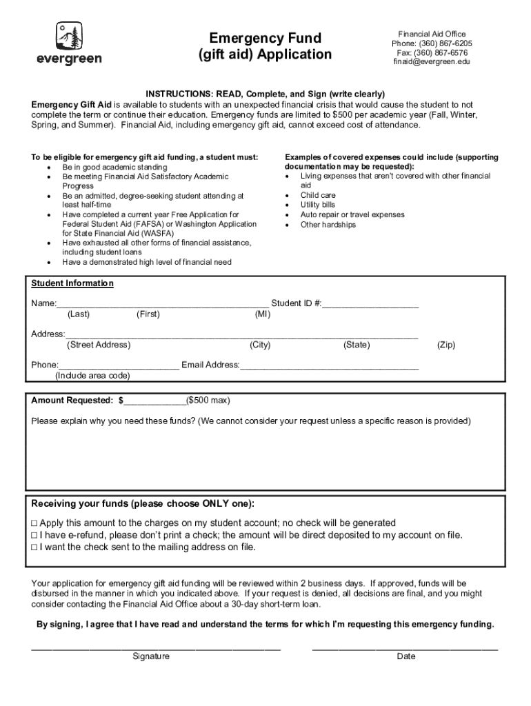 Emergency Fund (gift aid) ApplicationFinancial Aid Office Phone: (360) 8676205 Fax: (360) 8676576 finaid@evergreen.eduINSTRUCTIONS: READ, Complete, and Sign (write clearly) Emergency Gift Aid is available