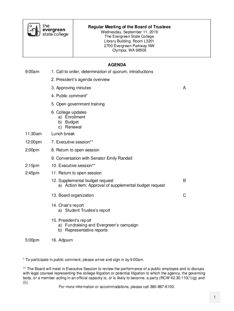 Regular Meeting of the Board of Trustees Wednesday, September 11, 2019, The Evergreen State College Library Building, Room L3201 2700 Evergreen Parkway NW Olympia, WA 98505AGENDA 9:00am1. Call to