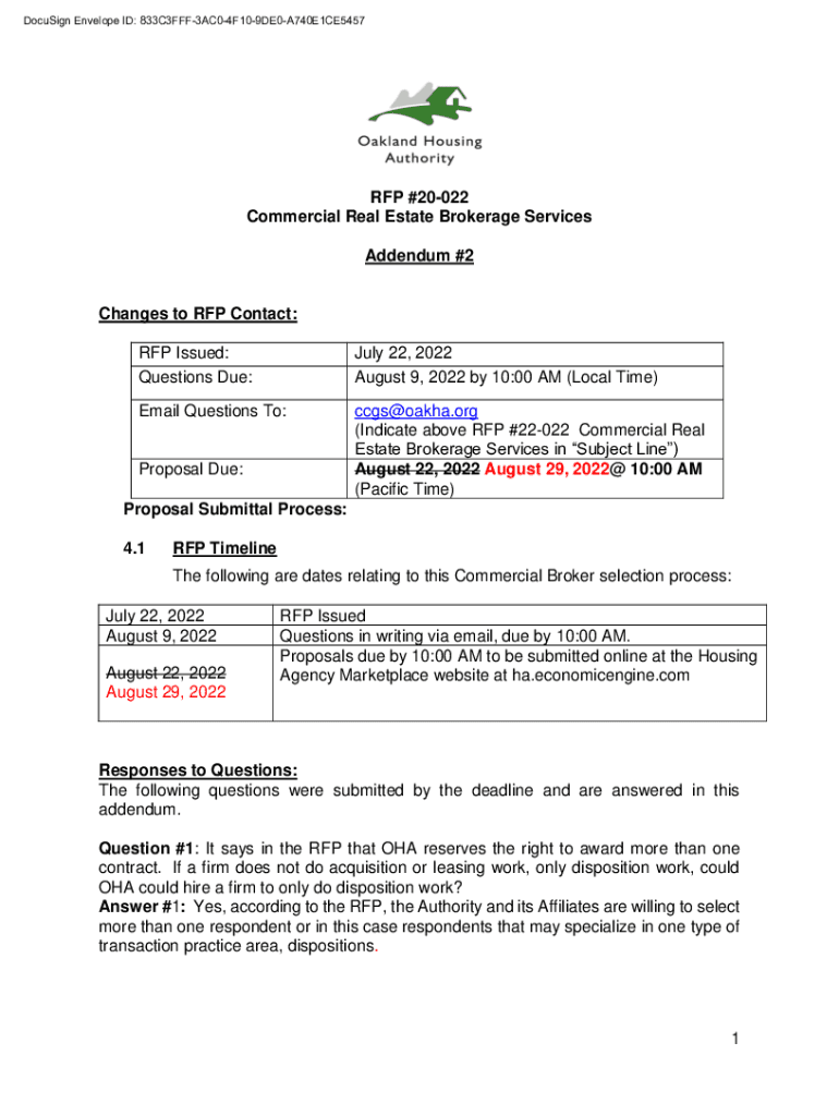 DocuSign Envelope ID: 833C3FFF3AC04F109DE0A740E1CE5457RFP #20022 Commercial Real Estate Brokerage Services Addendum #2Changes to RFP Contact: RFP Issued: Questions Due:July 22, 2022, August 9, 2022,