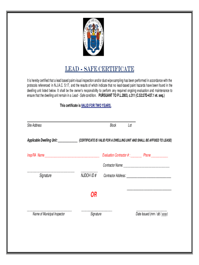 Lead SAFE CERTIFICATE It is hereby certified that a lead based paint visual inspection and/or dust wipe sampling has been performed in accordance with the protocols referenced in N.J.A.C. 5:17, and