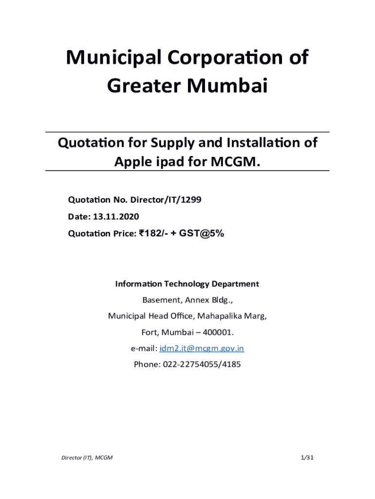 Municipal Corporation of Greater Mumbai Quotation for Supply and Installation of Apple iPad for MCG. Quotation No. Director/IT/1299 Date: 13.11.2020 Quotation Price: 182/ + GST@5%Information Technology