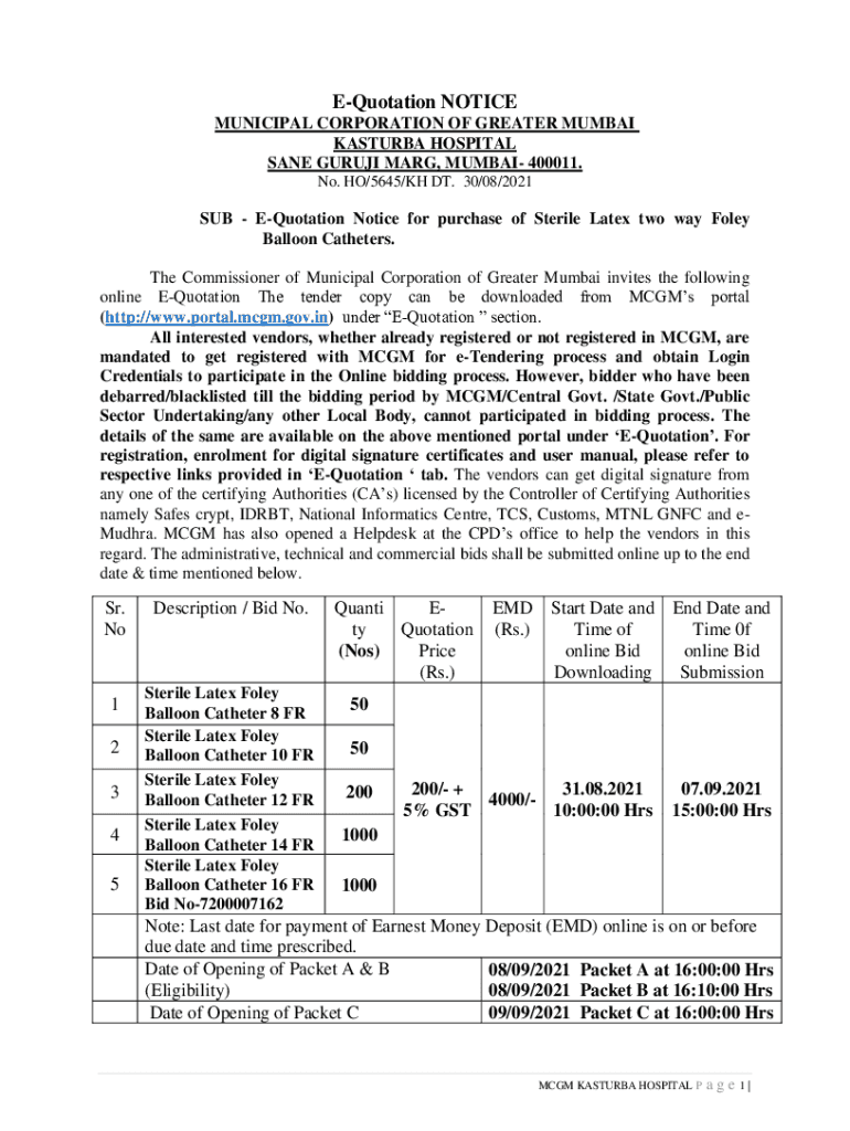 Quotation NOTICE MUNICIPAL CORPORATION OF GREATER MUMBAI PASTURE HOSPITAL SANE GURU MARY, MUMBAI 400011. No. HO/5645/KM DT. 30/08/2021SUB Quotation Notice for purchase of Sterile Latex two-way Foley
