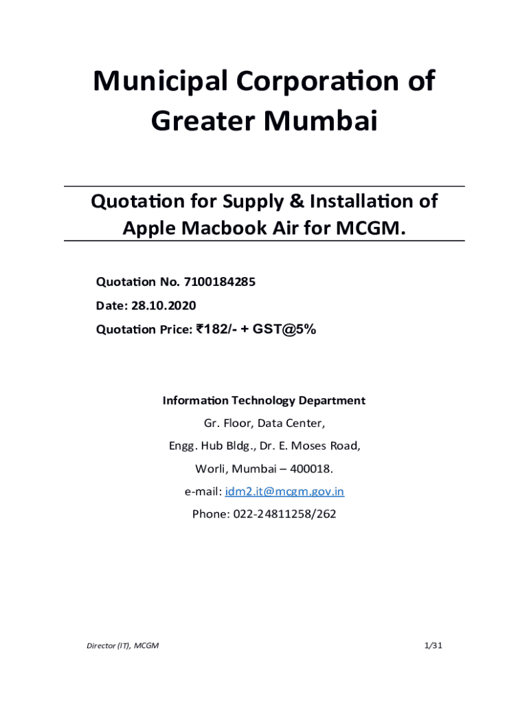 Municipal Corporation of Greater Mumbai Quotation for Supply & Installation of Apple MacBook Air for MCG. Quotation No. 7100184285 Date: 28.10.2020 Quotation Price: 182/ + GST@5%Information Technology