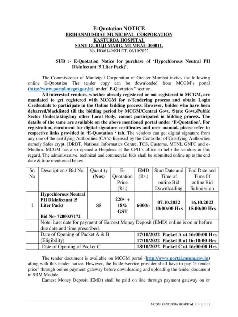 Quotation NOTICE BRIHANMUMBAI MUNICIPAL CORPORATION PASTURE HOSPITAL SANE GURU MARY, MUMBAI 400011. No. HO/6149/KM DT. 06/10/2022SUB : Quotation Notice for purchase of Hypochlorite Neutral PH Disinfectant