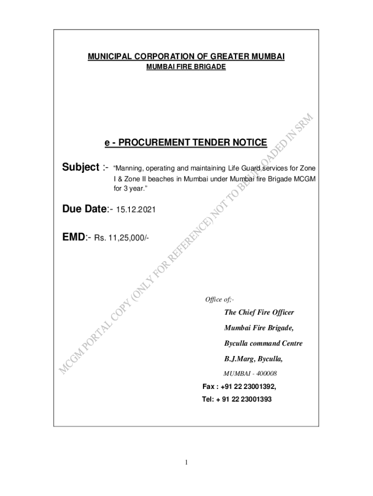 MUNICIPAL CORPORATION OF GREATER MUMBAI FIRE Brigade PROCUREMENT TENDER NOTICESubject :Manning, operating and maintaining Lifeguard services for Zone