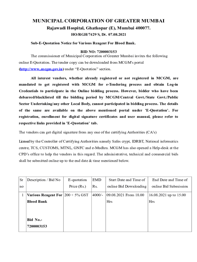 MUNICIPAL CORPORATION OF GREATER MUMBAI ATAWAD Hospital, Ghatkopar (E), Mumbai 400077. HO/GH/7429 S, DT. 07.08.2021 SubEQuotation Notice for Various Reagent For Blood Bank. BID NO: 7200003153 The