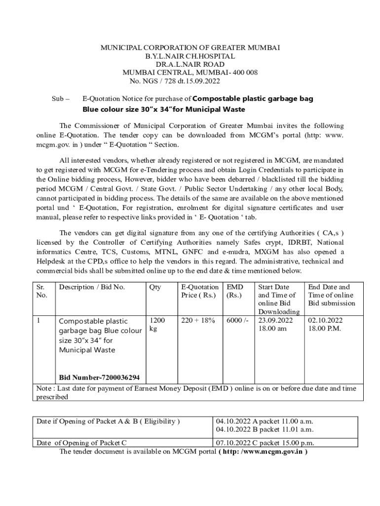 MUNICIPAL CORPORATION OF GREATER MUMBAI B.Y.L.NAIR CH.HOSPITAL DR. A.L.NAIR ROAD MUMBAI CENTRAL, MUMBAI 400 008 No. NGS / 728 DT.15.09.2022 Sub Quotation Notice for purchase of Compostable plastic