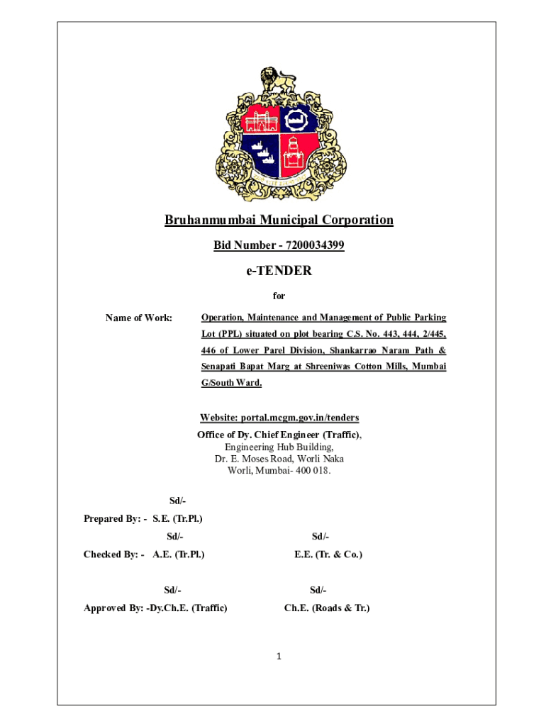 Bruhanmumbai Municipal Corporation Bid Number 7200034399eTENDER for Name of Work:Operation, Maintenance and Management of Public Parking Lot (PPL) situated on plot bearing C.S. No. 443, 444, 2/445,