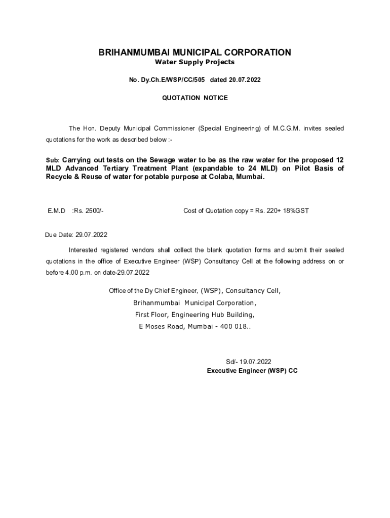 BRIHANMUMBAI MUNICIPAL CORPORATION Water Supply Projects No. Dy. Ch. E/WSP/CC/505 dated 20.07.2022 QUOTATION Notice Hon. Deputy Municipal Commissioner (Special Engineering) of M.C.G.M. invites sealed
