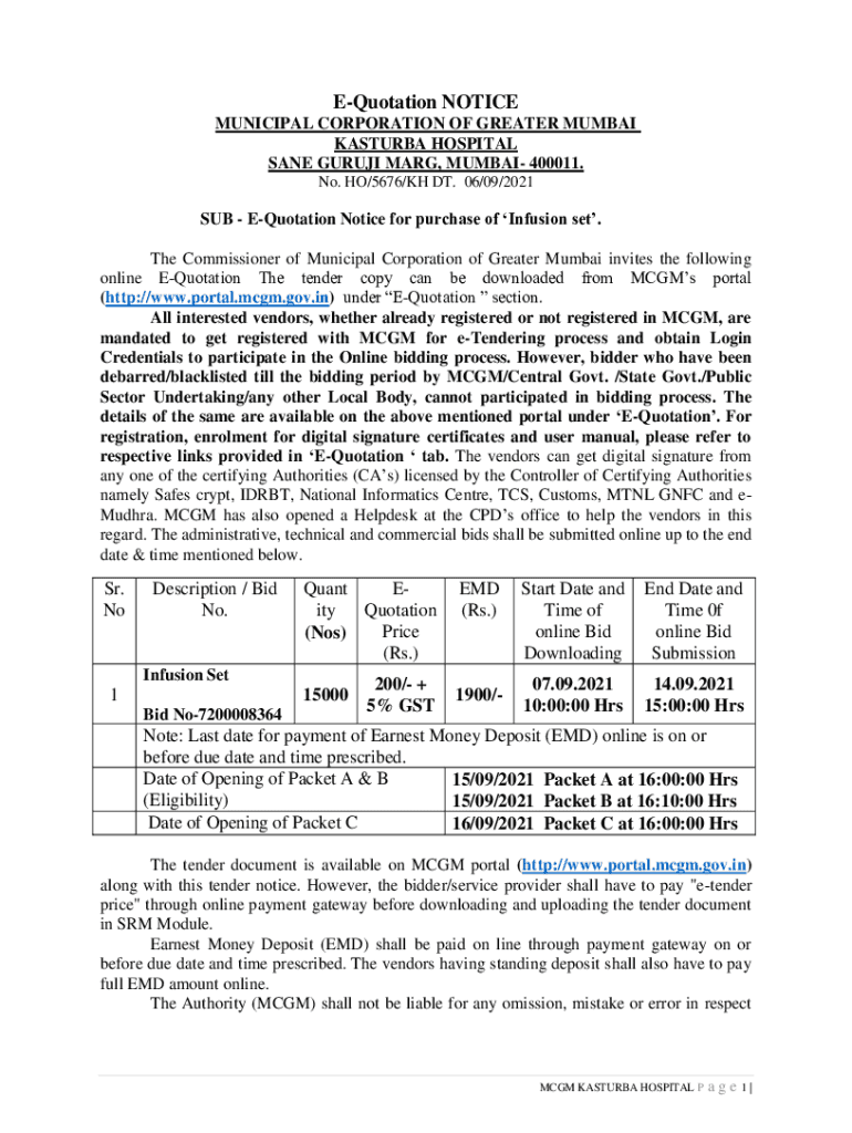Quotation NOTICE MUNICIPAL CORPORATION OF GREATER MUMBAI PASTURE HOSPITAL SANE GURU MARY, MUMBAI 400011. No. HO/5676/KM DT. 06/09/2021SUB Quotation Notice for purchase of Infusion set. The Commissioner