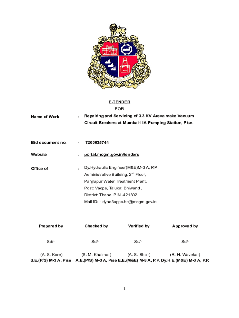 TENDER FOR Name of Work:Repairing and Servicing of 3.3 KV Area make Vacuum Circuit Breakers at MumbaiIIIA Pumping Station, Pisé. Bid document no.:7200035744Website:portal.mcgm.gov.in/tendersOffice
