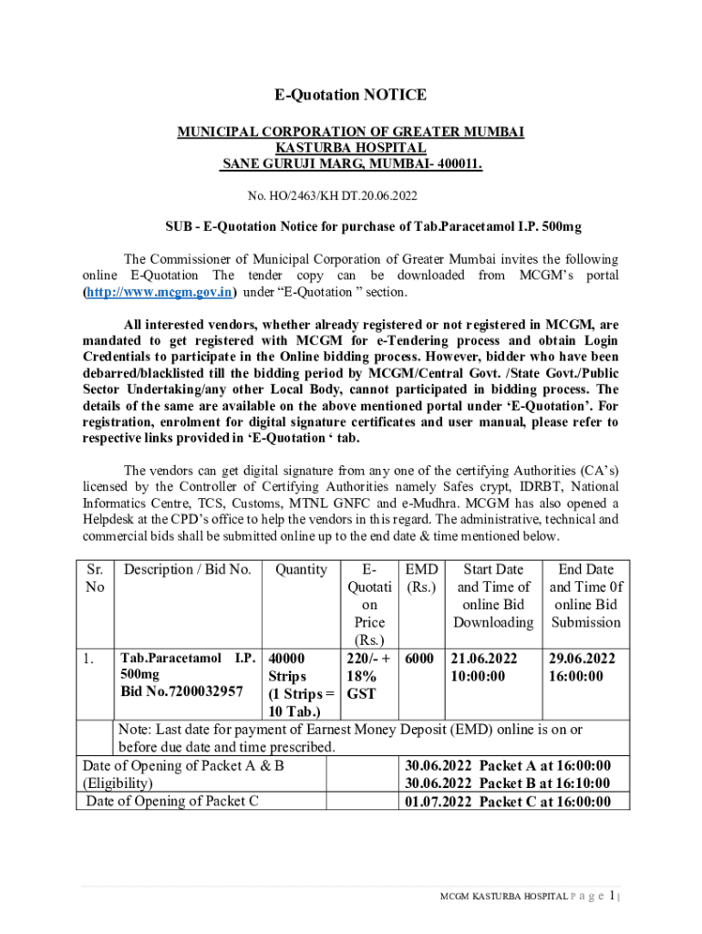 Quotation NOTICE MUNICIPAL CORPORATION OF GREATER MUMBAI PASTURE HOSPITAL SANE GURU MARY, MUMBAI 400011. No. HO/2463/KM DT.20.06.2022SUB Quotation Notice for purchase of Tab. Paracetamol I.P. 500 mg